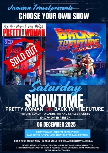 Returns 06 December 2025. Coach departing at 5.30pm - stopping for 20 minutes. Expected arrival in Canberra 9.00pm - 9.30pm.